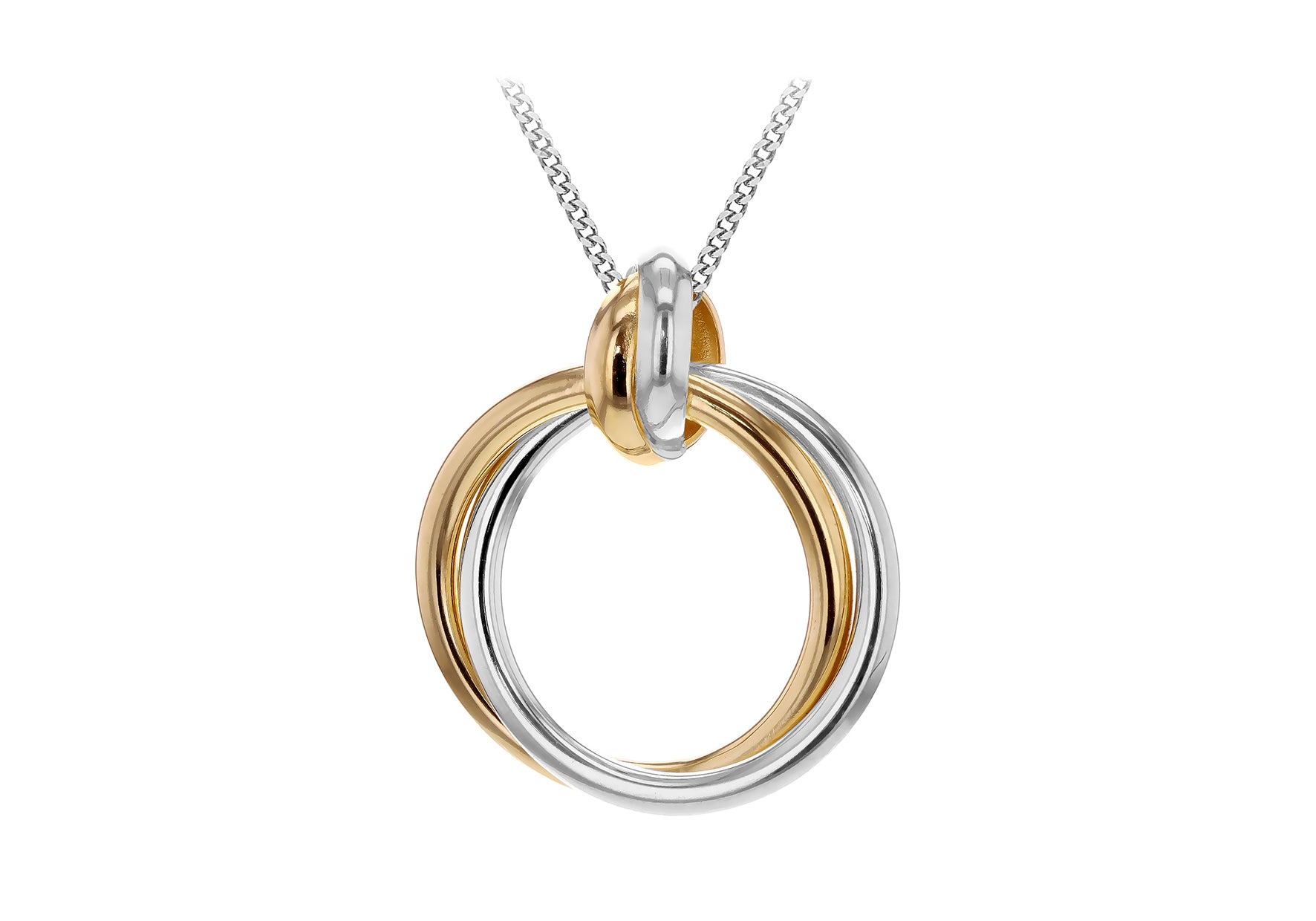 Elegant in form and rich in contrast, this pendant blends contemporary design with timeless allure. Featuring two seamlessly interlocked hoops, one in warm yellow gold and the other in cool white gold, it creates a striking visual harmony that symbolises unity and balance. The polished finish enhances the interplay of tones, offering subtle brilliance with every movement. Sophisticated yet versatile, this pendant makes an effortless statement.