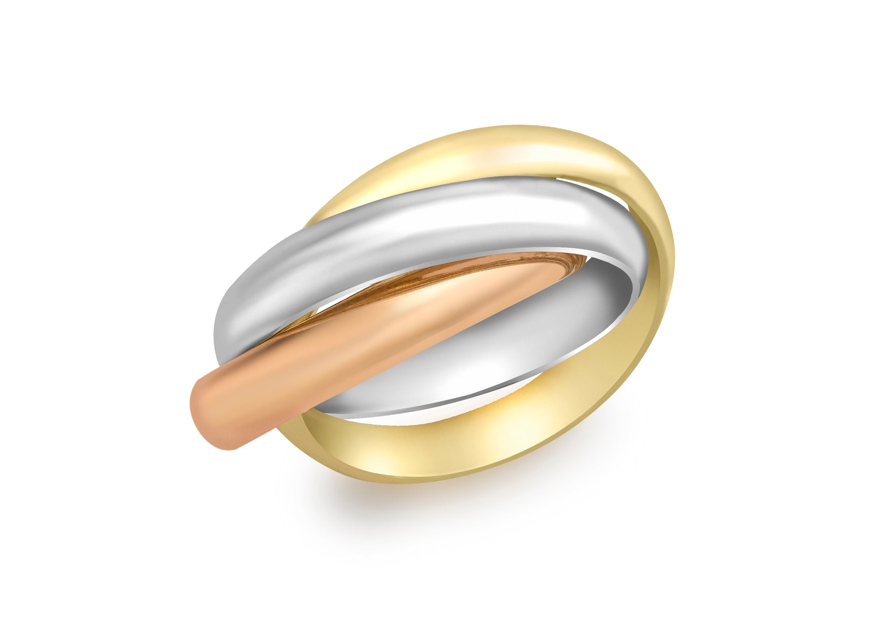 This timeless piece showcases three beautifully interwoven bands, each meticulously crafted from yellow, white, and rose gold, creating a harmonious blend of warmth and radiance. The fluid motion of the interlocking rings symbolises unity, eternity, and sophistication.