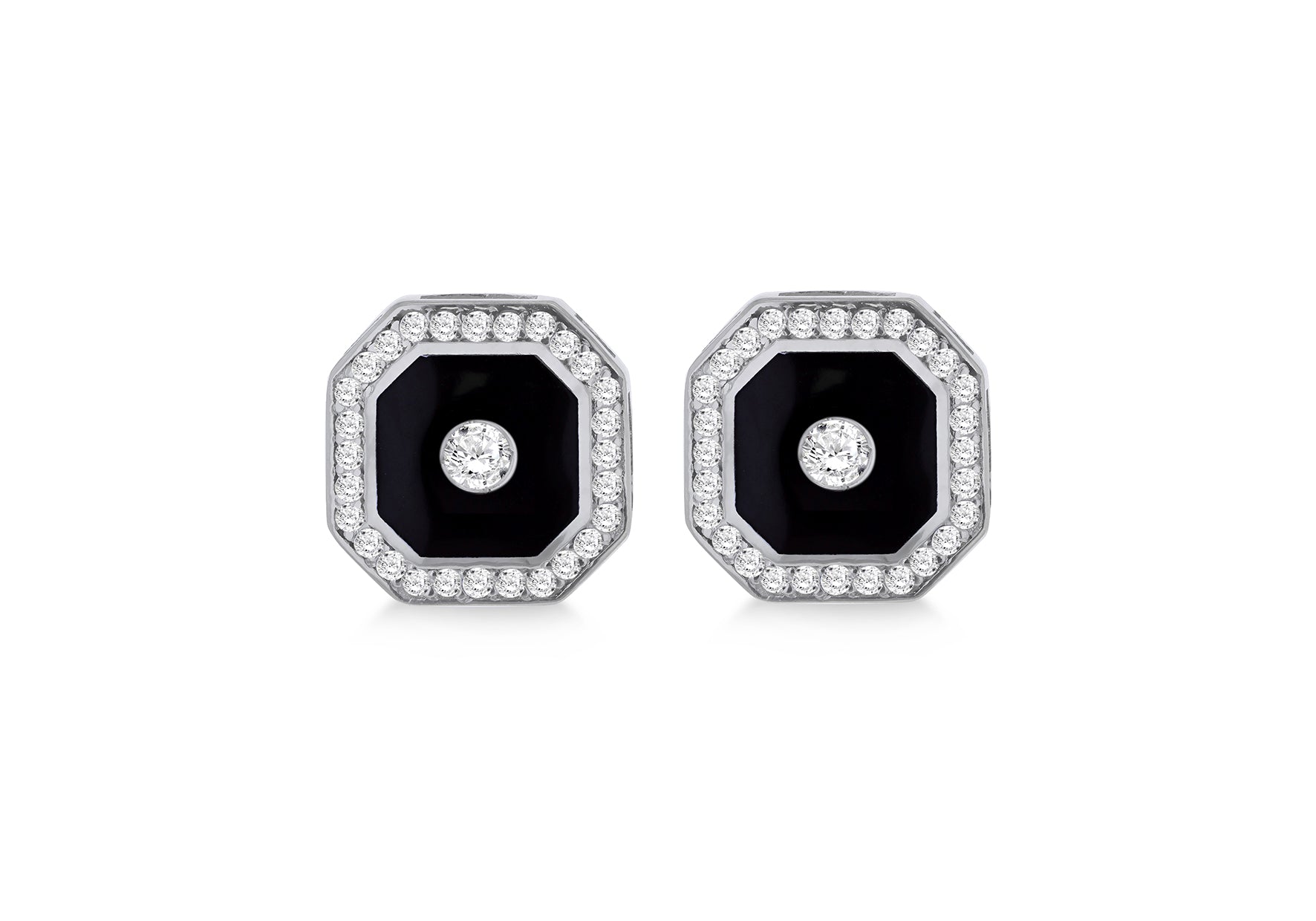 Details: Depth 3.5mm Width: 10.5mm Height: 10.5mm Finish: Enamel/ Polished Fitting: Post Setting: Bezel/Pave Stone Details: 1 x 0.06ct and 56 x 0.01ct Round White Diamonds Style: Stud Product Type: Earrings Metal Colour: White Metal: 9ct Gold