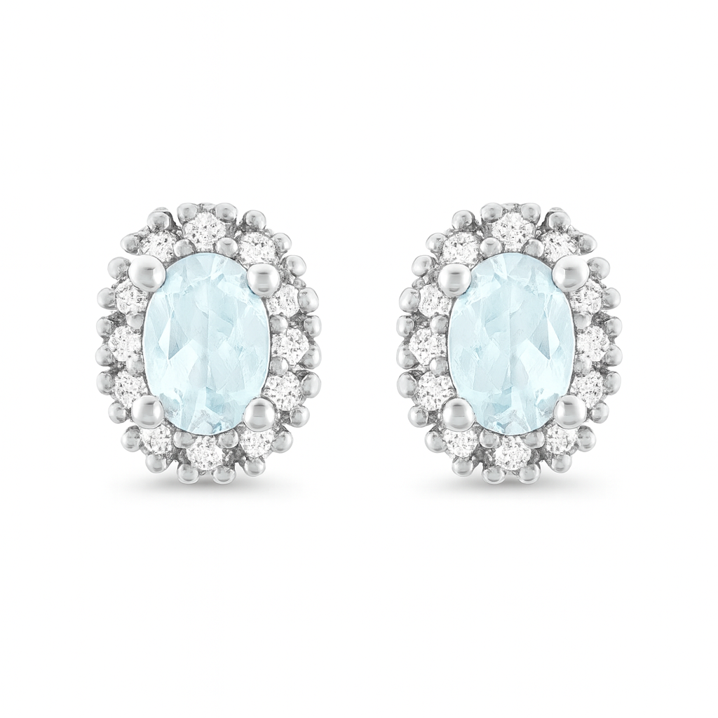 These stud earrings in fine white gold centre on oval-cut aquamarines, chosen for their delicate blue tone and natural clarity. Surrounding each stone is a cluster halo of round brilliant diamonds, totalling 0.10 carats, arranged to enhance the colour and radiance of the aquamarines.
