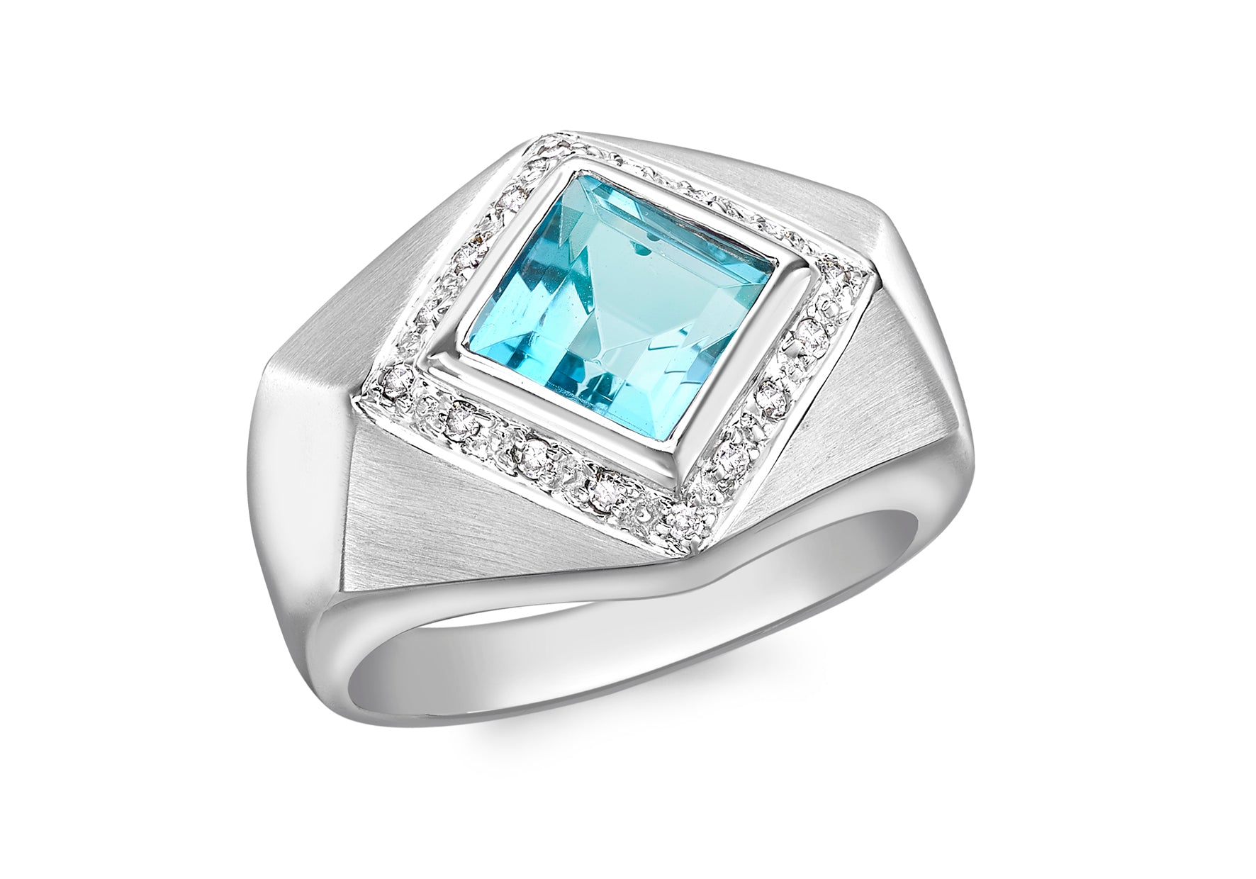 This striking signet ring in fine white gold combines bold geometry with refined detailing. At its centre sits a square-cut blue topaz, its vivid hue drawing the eye with crisp brilliance. Surrounding the gemstone is a precise halo of diamonds totalling 0.11 carat, adding radiance and depth to the design.
