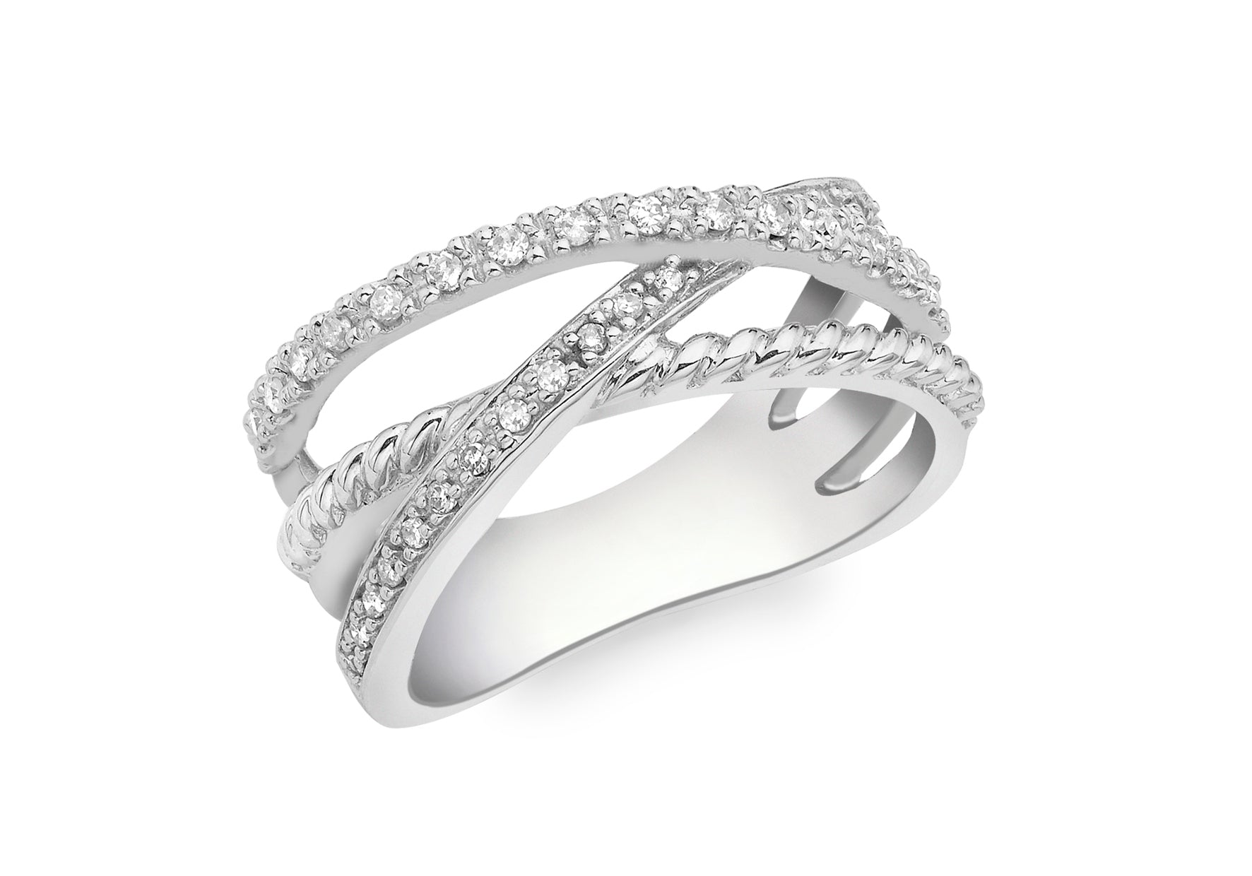 The crossover structure gives the ring a sense of movement and depth, highlighting the interplay of light against the brilliance of the diamonds. Crafted in 9ct white gold, this piece combines modern styling with timeless sophistication, making it a versatile choice for both everyday wear and special occasions.