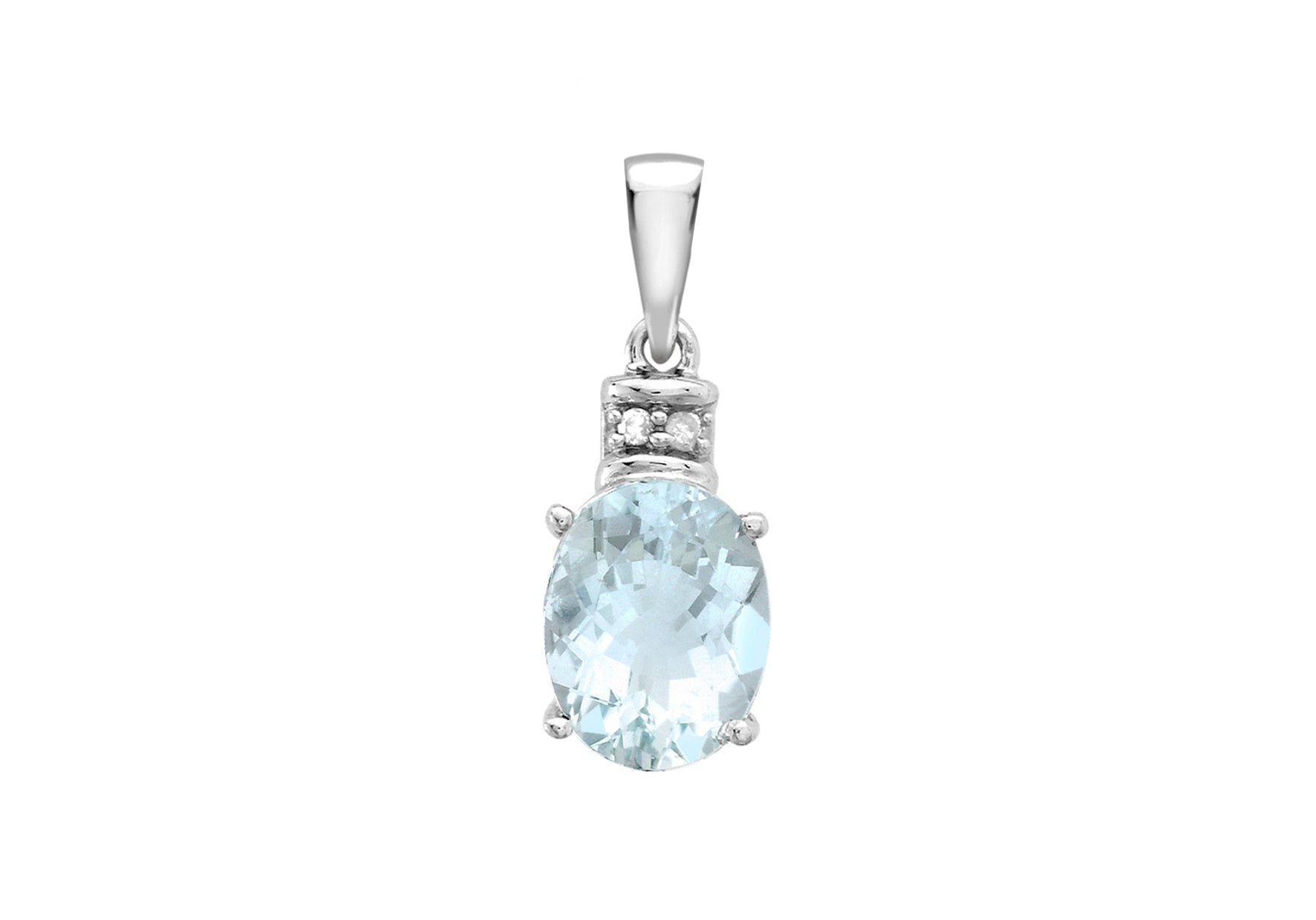 Average Carat Weight: 1.25ct Pendant Height: Including Bail 17.6mm Pendant Width: 6.1mm Finish: Polished Setting: Claw Stone Details: 1 x 6.1mm x 8mm Oval Aquamarine, 2 x 1mm Round Diamonds Style: Stone Set Product Type: Pendants Metal Colour: White Metal: 9ct Gold