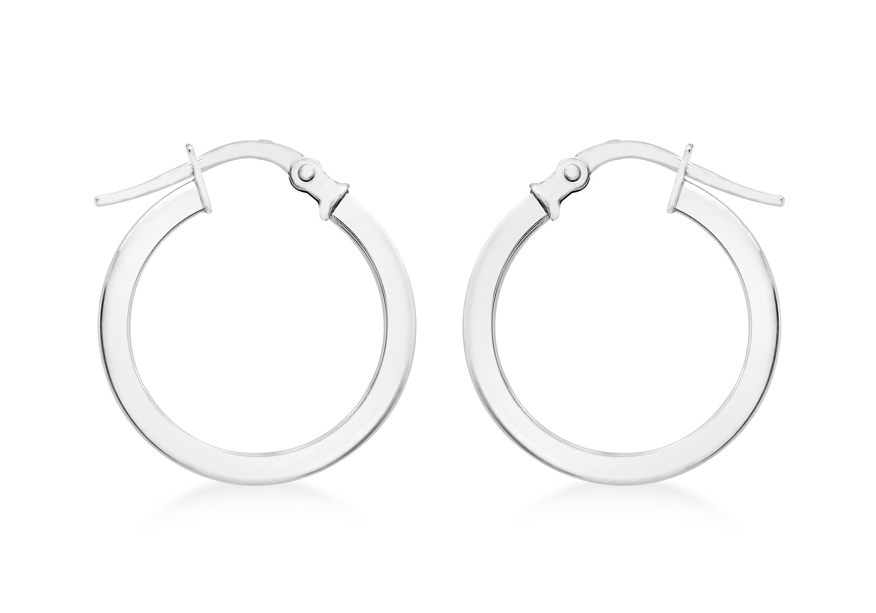 Details: 2mm Square Tube Diameter: 18mm Finish: Polished Fitting: Hinged Post Style: Creole Product Type: Earrings Metal Colour: White Metal: 9ct Gold
