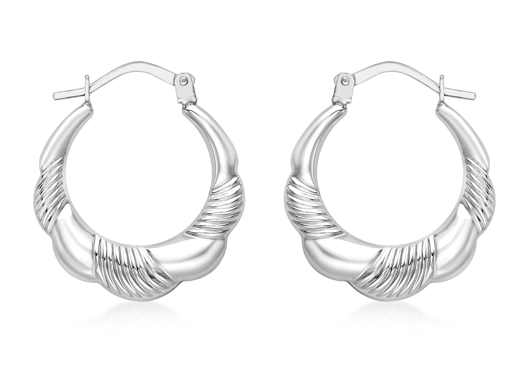 Width: 19mm Height: 22mm Fitting: Hinged Post Style: Creole Product Type: Earrings Metal Colour: White Metal: 9ct Gold