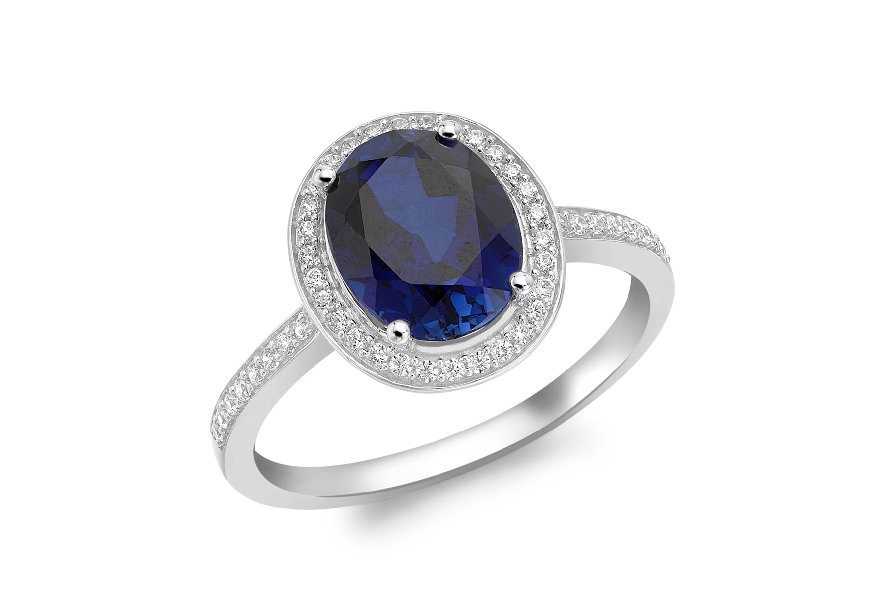 Details: Ring Face 11.7mm x 13.4mm; Ring Shank: 1.8mm; Finish: Polished; Setting: Claw; Stone Details: 48 x 1mm Round White CZs, 1 x 8mm x 10mm Oval Blue CZ; Style: Stone Set Metal Colour: White Metal: 9ct Gold