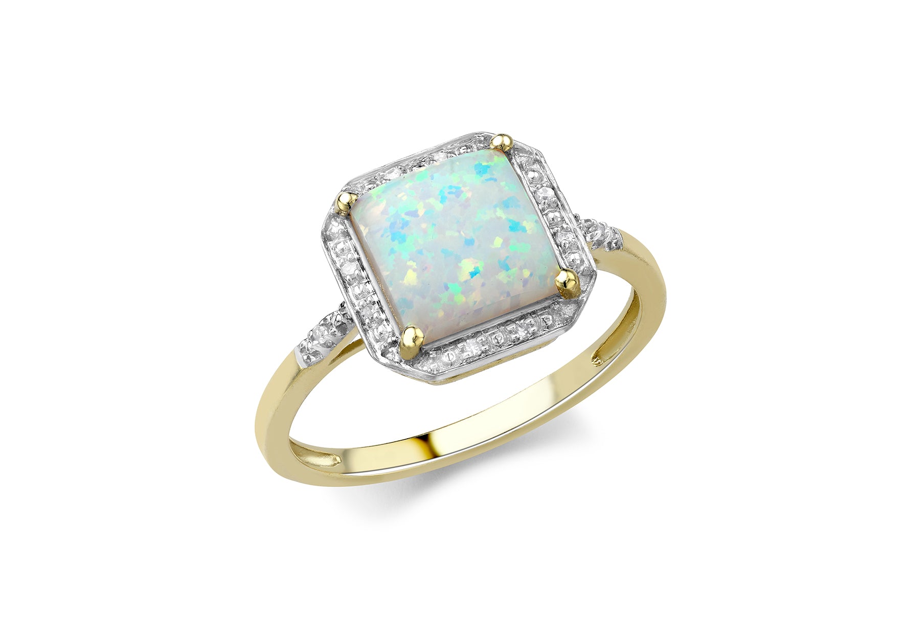 9ct Yellow Gold 0.03ct Diamond & Opal Square Halo Ring