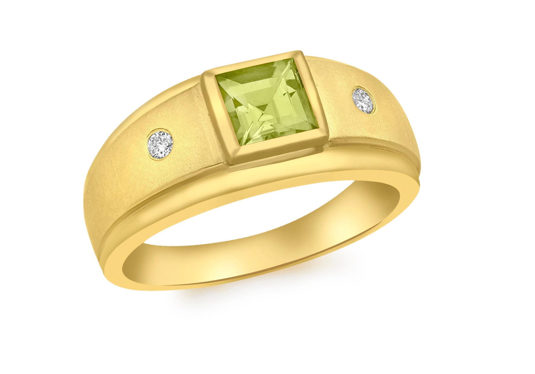 This ring is defined by clean lines and a vibrant centrepiece. At its heart rests a square-cut peridot, known for its fresh green hue and natural brilliance. Framing the gemstone, a pair of round diamonds totalling 0.05ct is set to either side, their sparkle providing contrast and enhancing the vivid tone of the peridot.