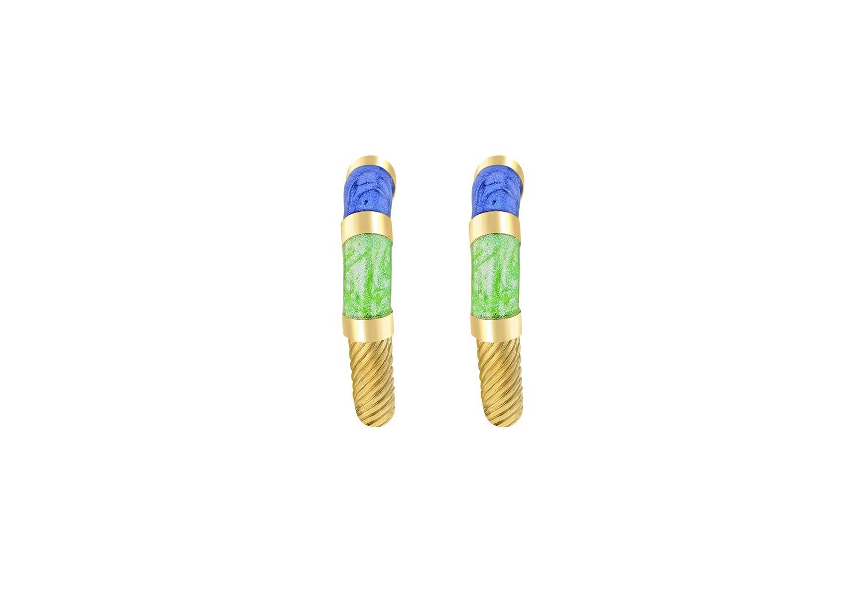 These earrings bring a vibrant edge to a timeless silhouette. The graceful curve of each hoop is accentuated by a blend of blue and green glaze, flowing seamlessly across the fine polished gold surface. The intertwining design creates a sense of motion and fluidity, while the rich enamel tones add depth and personality. A refined statement for everyday elegance or evening accents, these hoops balance bold colour with classic craftsmanship.