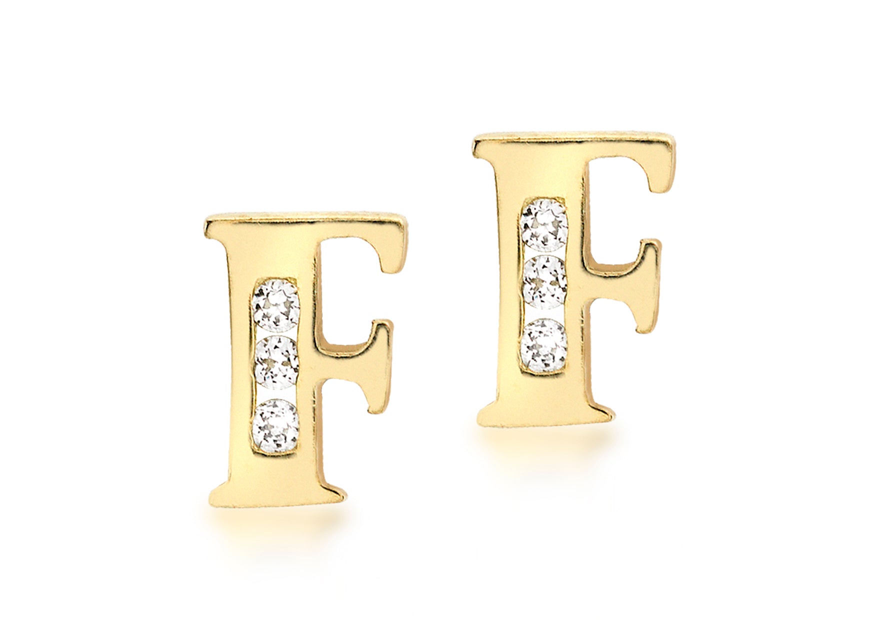 9ct Yellow Gold Zirconia 5mm x 7mm 'F' Initial Stud Earrings Width: 5mm; Height: 7mm; Fitting: Post; Style: Stud Metal Colour: Yellow Metal: 9ct Gold