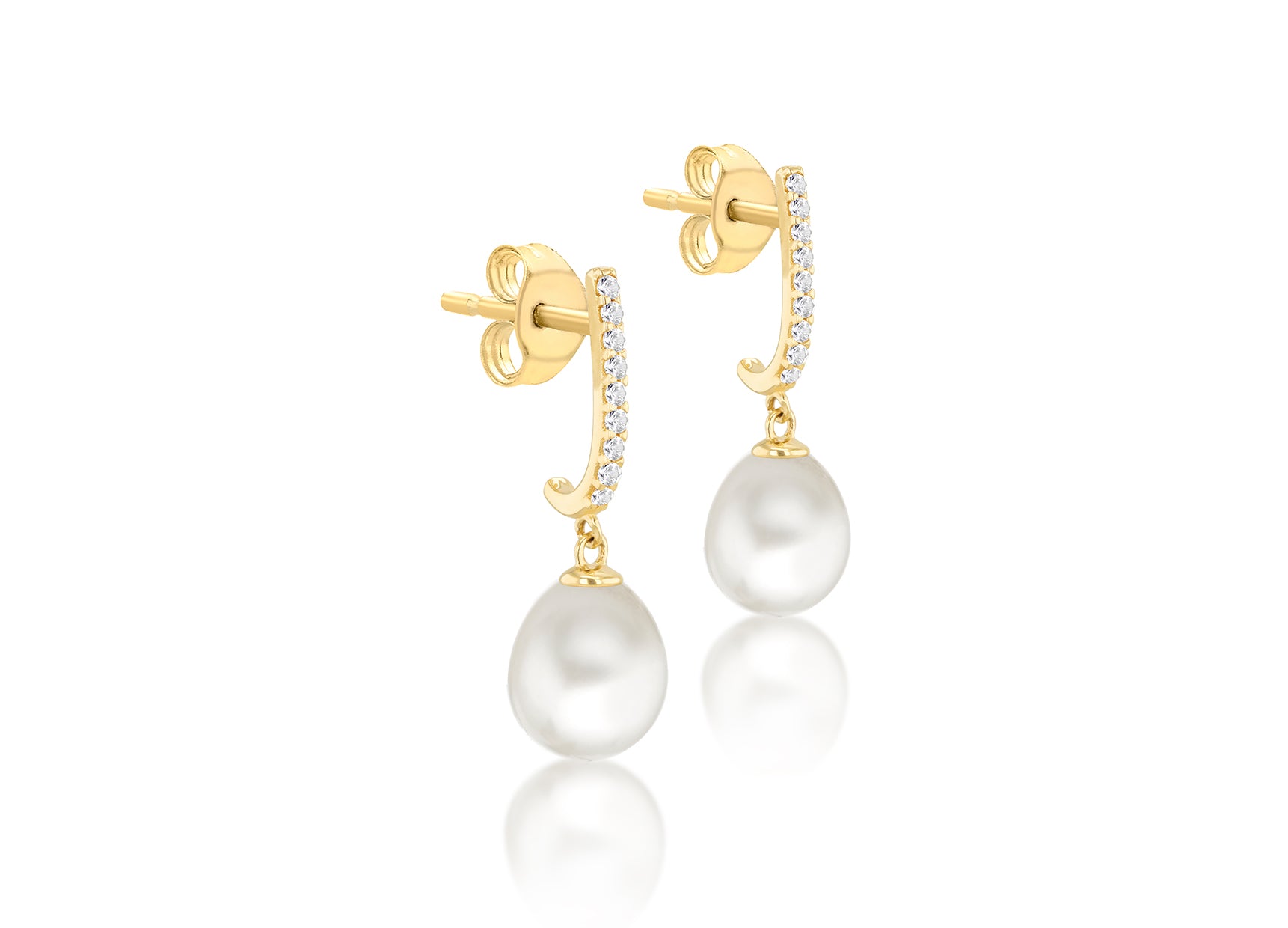 Timeless elegance meets subtle brilliance in these earrings. Each earring features a luminous freshwater pearl, naturally radiant and perfectly rounded, suspended beneath a delicate white zirconia accent that offers a refined touch of sparkle. The pairing of the warm gold tones with the soft lustre of the pearl and the clarity of zirconia creates a graceful contrast, understated yet effortlessly striking.