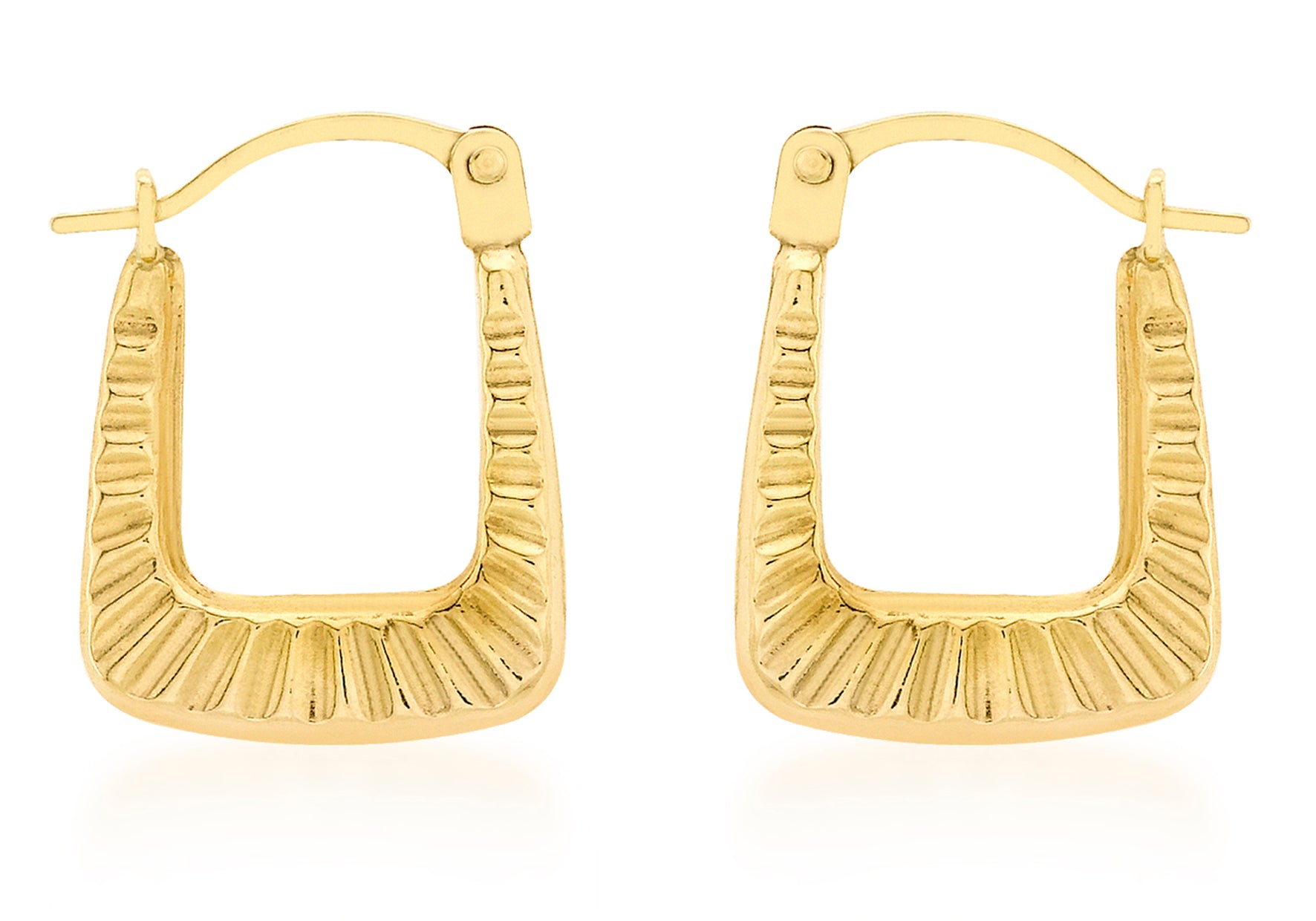 Width: 12mm Height: 15mm Fitting: Hinged Post Style: Creole Product Type: Earrings Metal Colour: Yellow Metal: 9ct Gold