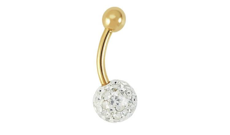 Width: 8mm Height: 22mm Finish: Polished Fitting: Screw Stone Details: White Crystals Style: Stone Set Product Type: Belly Bars Metal Colour: Yellow Metal: 9ct Gold