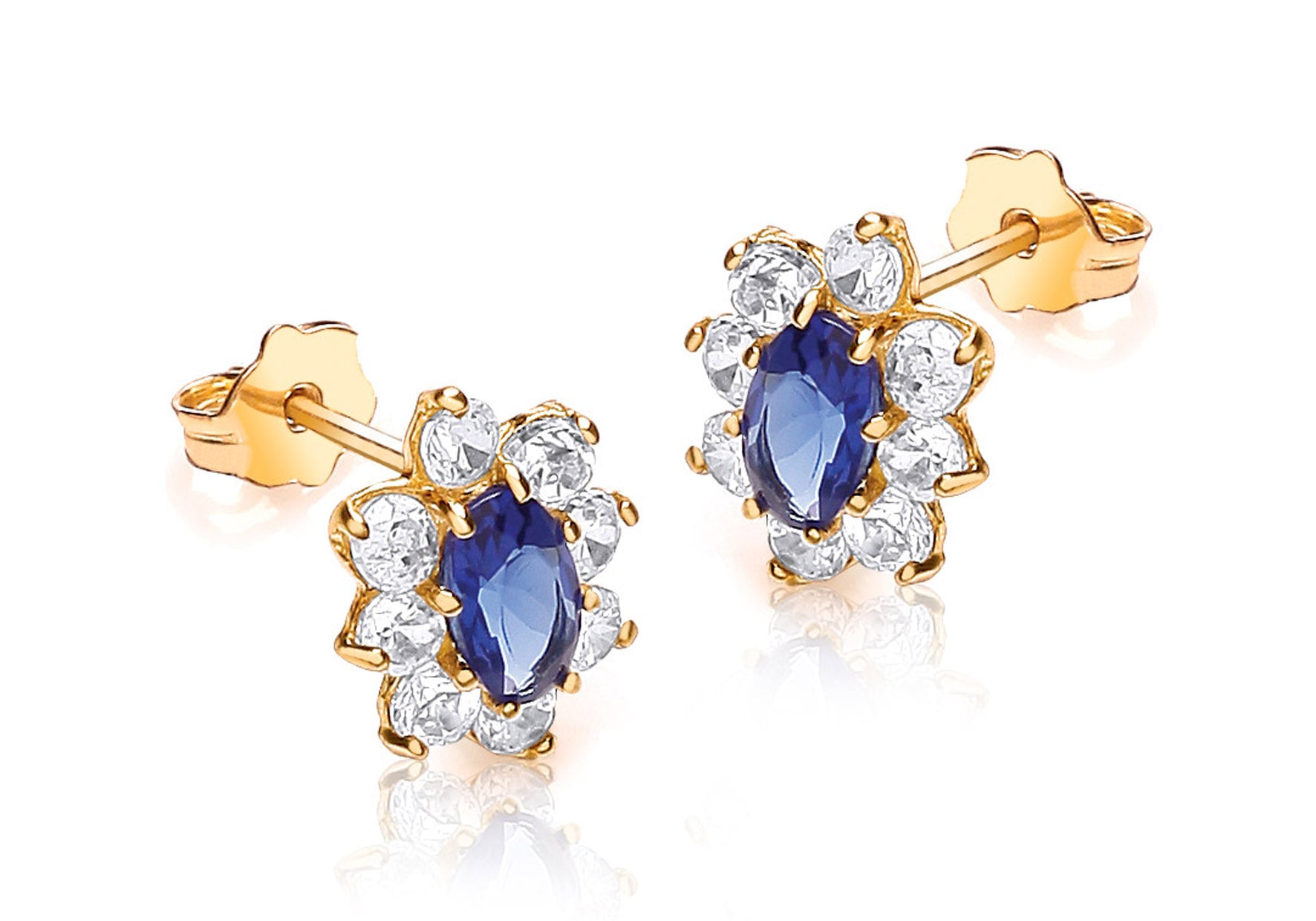 9ct Yellow Gold White and Oval Blue Zirconia Flower Cluster Stud Earrings