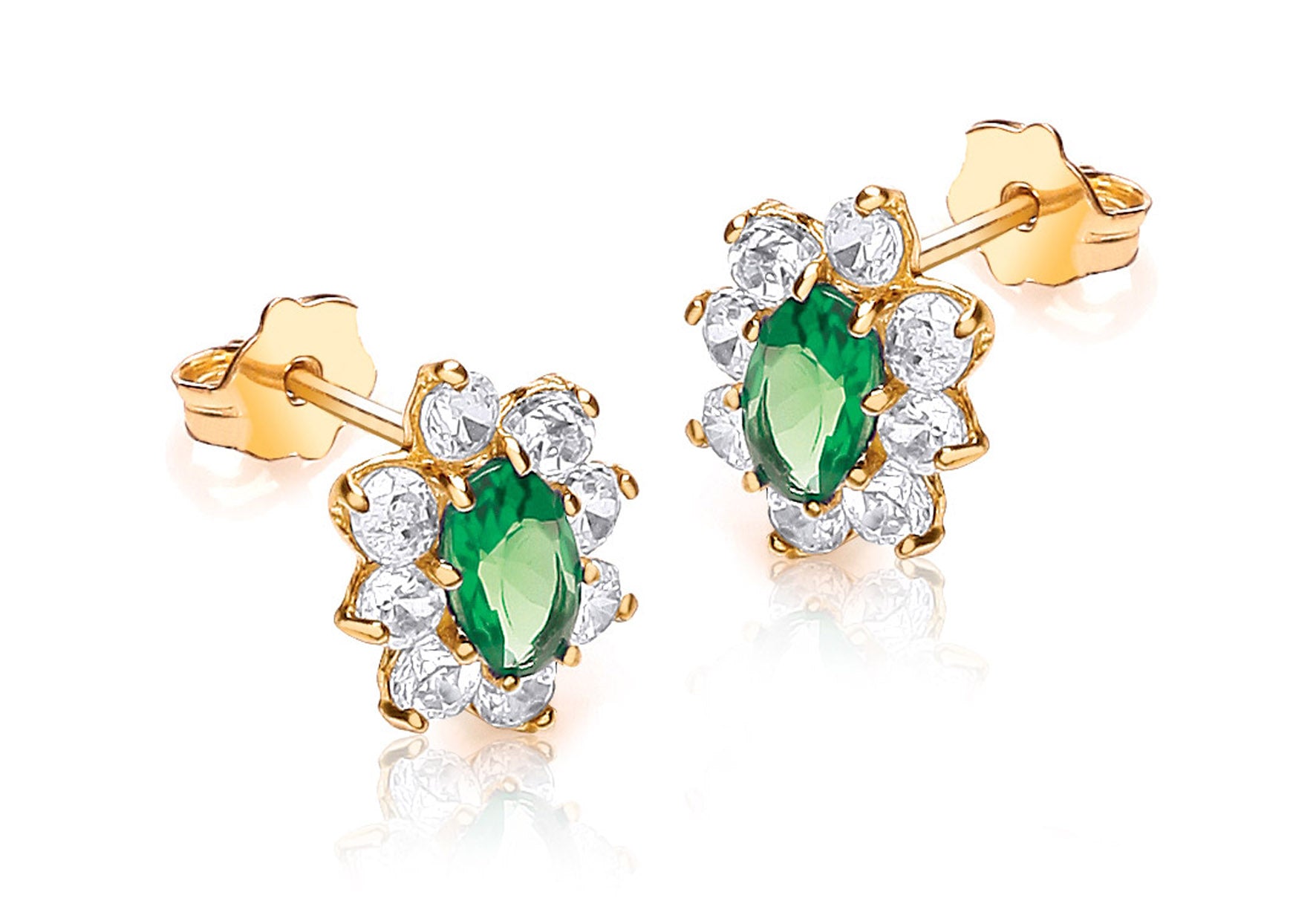 9ct Yellow Gold White and Oval Green Zirconia Flower Cluster Stud Earrings