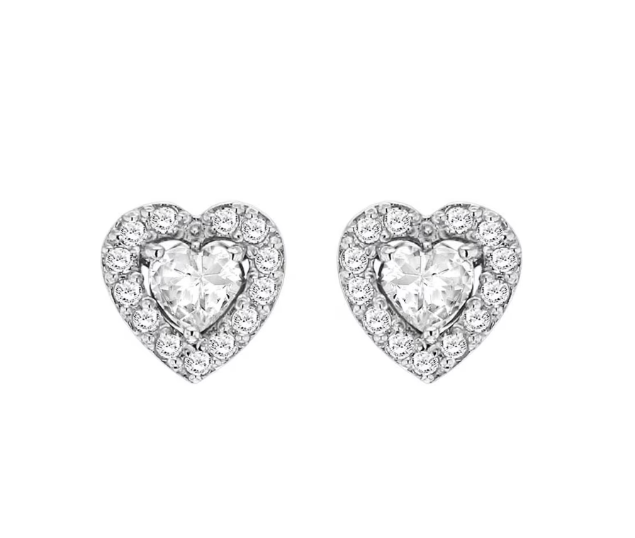 Width: 8.6mm Height: 8.7mm Finish: Rhodium Plated Fitting: Post Setting: Claw / Pave Stone Details: 2 x 4.2mm x 4.7mm Heart-Shaped White CZs, 26 x 1.3mm Round White CZ Style: Stud Product Type: Earrings Metal Colour: Rhodium Metal: Silver