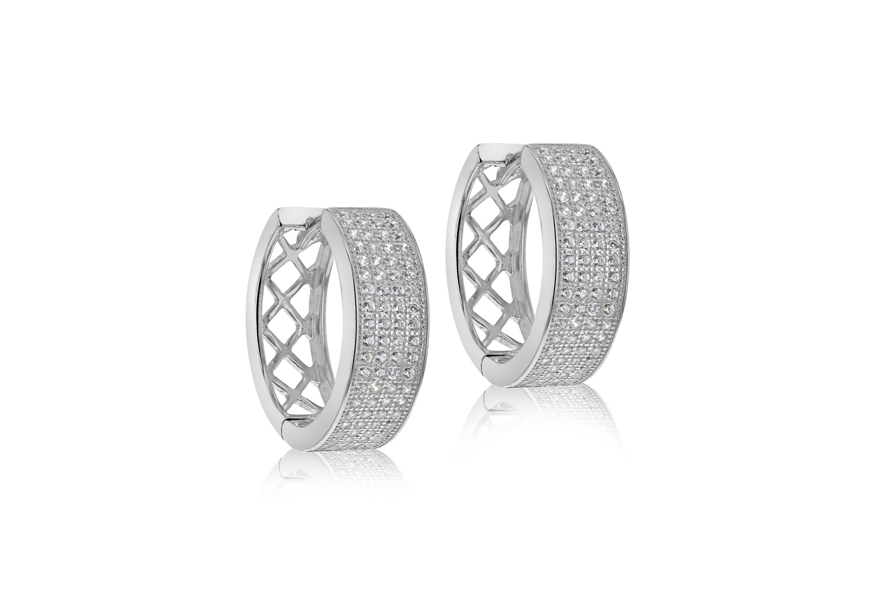 Diameter: 18.3mm Finish: Rhodium Plated Fitting: Lever Back Setting: Pave Stone Details: 160 x 1mm Round White CZs Style: Creole Product Type: Earrings Metal Colour: Rhodium Metal: Silver