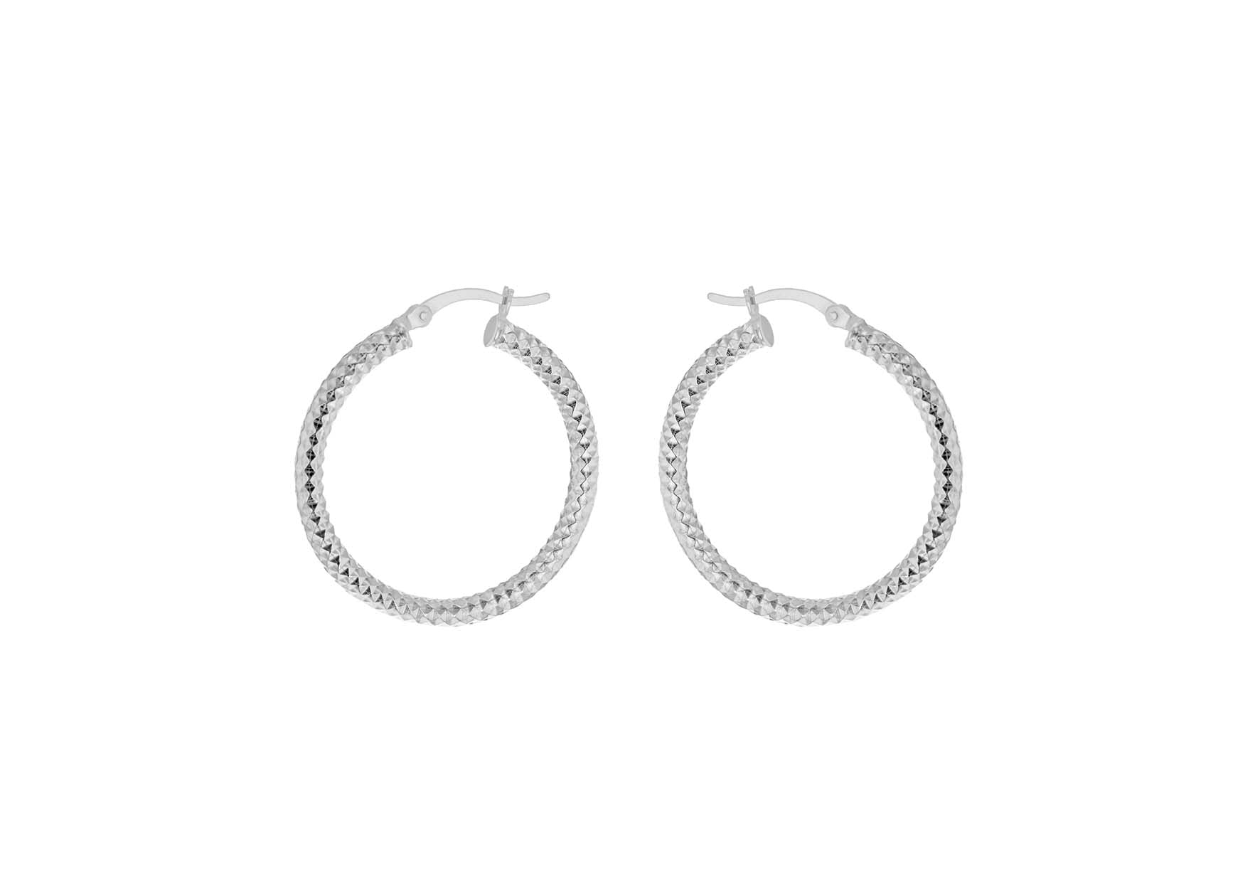 Details: Inner Diameter 24mm Width: Round Tube 3mm Diameter: 30mm Finish: Diamond Cut / Rhodium Plated Fitting: Hinged Post Style: Creole Product Type: Earrings Metal Colour: Rhodium Metal: Silver