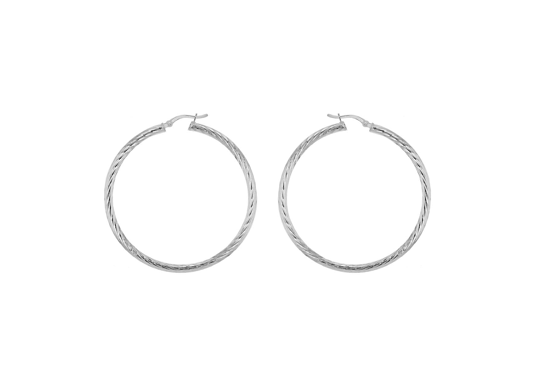 Details: Round Tube Width 3mm; Diameter: 50mm; Finish: Diamond Cut; Fitting: Hinged Post; Style: Creole Metal Colour: Silver Metal: Silver