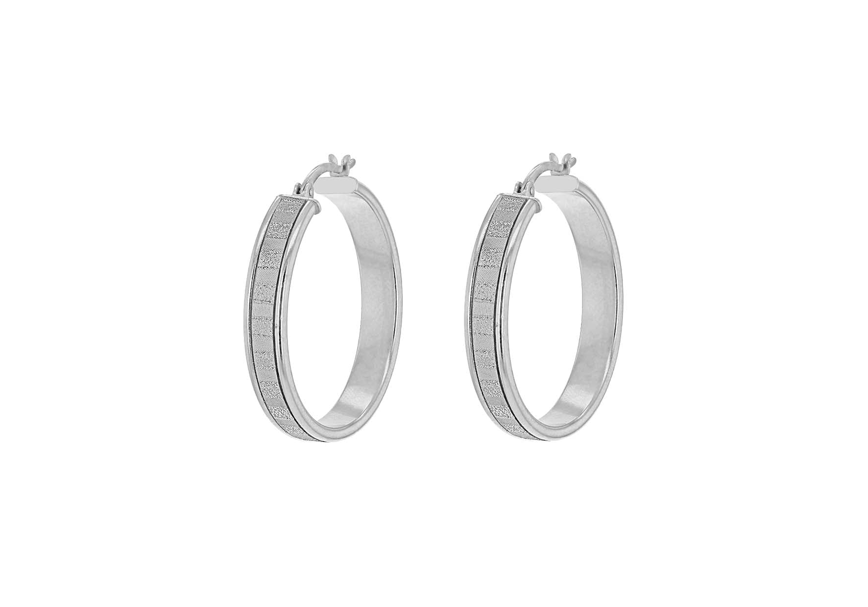 Width: Tube 5mm Diameter: 30mm Finish: Rhodium Plated / Textured Fitting: Hinged Post Style: Creole Product Type: Earrings Metal Colour: Rhodium Metal: Silver