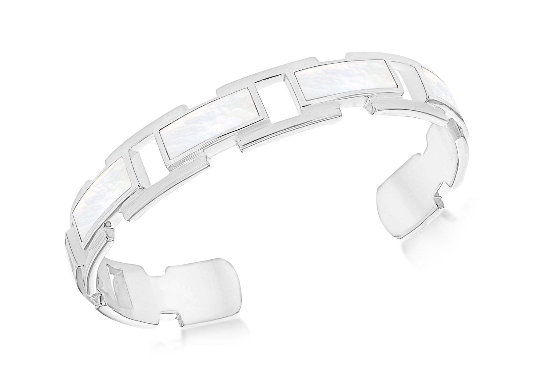 Shape: Oval Bangle Width: 12.5mm Width: 63mm Height: 49mm Finish: Polished Stone Details: 7 x 16mm x 6mm White Mother of Pearl Sections Clasp: Cuff Style: Stone Set Product Type: Bangles Metal Colour: Silver Metal: Silver