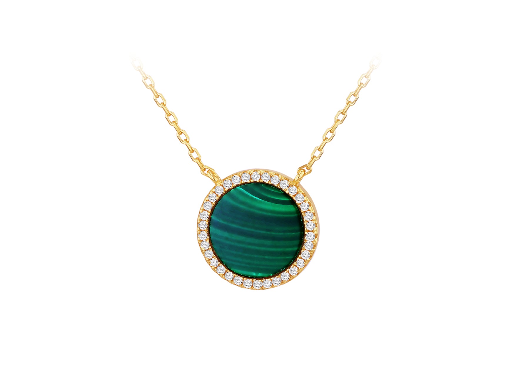 Pendant Height: 15mm Pendant Width: 15mm Length: 42-45cm Finish: Gold Plated / Polished Setting: Bezel/Claw Stone Details: 12mm Round Malachite 36x1mm White CZ Clasp: Lobster Style: Stone Set Product Type: Necklaces Metal Colour: Yellow Metal: Silver